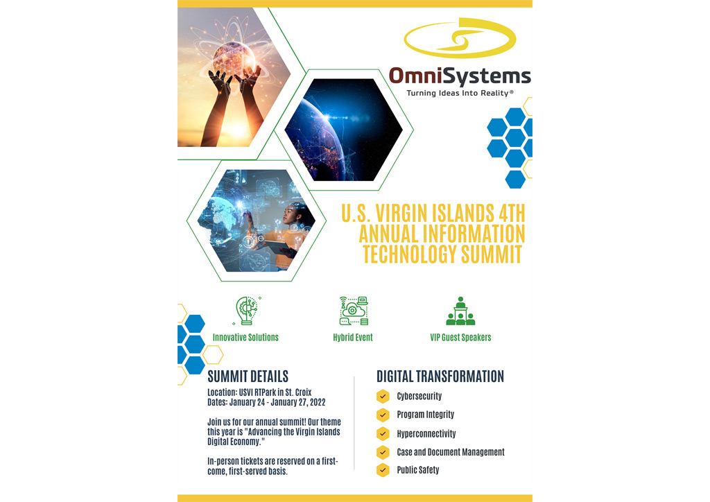 OmniSystems is pleased to announce that our 4th Annual U.S. Virgin Islands Information Technology Summit will be held on January 24th – 27th, 2022. The Summit will take place at The University of the Virgin Islands Research and Technology Park (RTPark) facility located in St. Croix, USVI. There will be discussions around the technology investments being considered and made by the Virgin Islands’ leaders. These investments will be needed to secure and deploy innovative digital solutions to improve a variety of government services to USVI citizens and many guests who visit the territory.